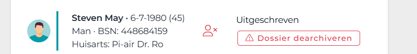 Als een patiënt is utigeschreven of overleden, is het dossier niet meer zichtbaar en niet meer te vinden door te zoeken. Gebruikers met de rol Administratie kunnen de patiënten nog wel vinden door ze te zoeken. Deze patiënten staan in het zoekscherm gemarkeerd als Uitgeschreven of Overlden :