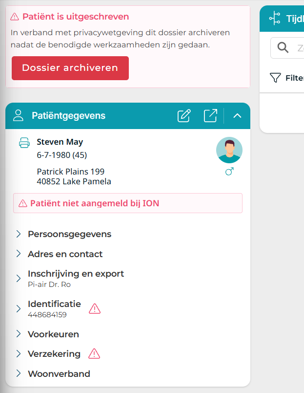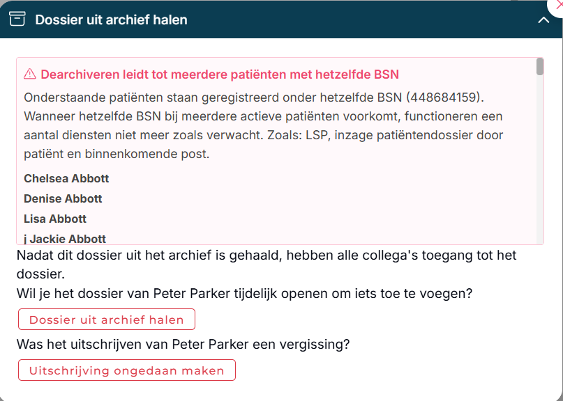 Als de patiënt uit het archief gehaald is, wordt bij het dossier een melding getoond ter herinnering om de patiënt opnieuw te archiveren. Indien je kiest voor Uitschrijving ongedaan maken is het mogelijk om het dossier weer te gebruiken.