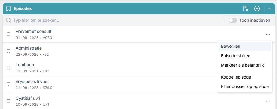 Om een episode aan te passen, open je via de drie puntjes rechts in de episoderegel een menu. Hier kun je de episode bijvoorbeeld bewerken of markeren als belangrijk. Om een episode op inactief te zetten, selecteer je episode sluiten.