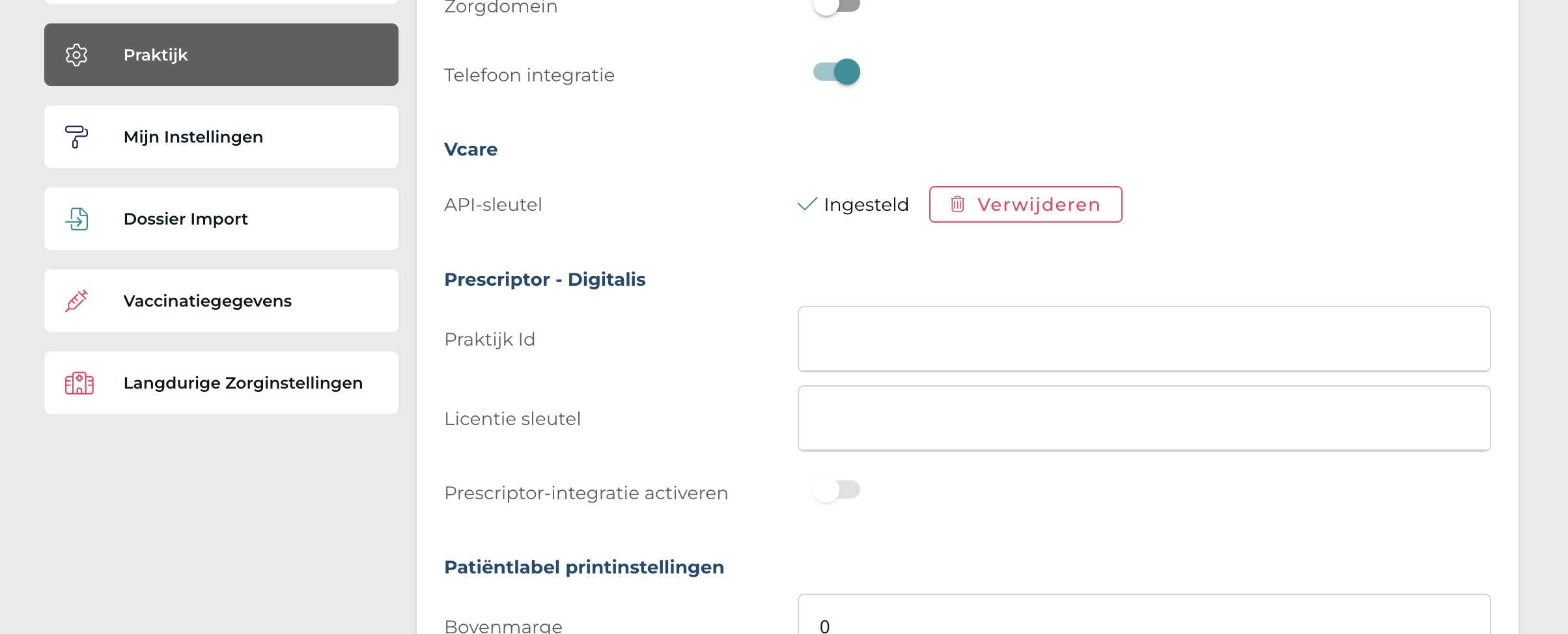 - Ga naar Administratie > Praktijk > Externe portalen > Prescriptor - Digitalis