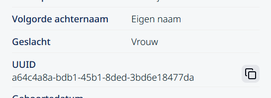 In de patiëntenkaart is onder het kopje persoonsgegevens het UUID te vinden. Dit is het unieke patiënt Id.