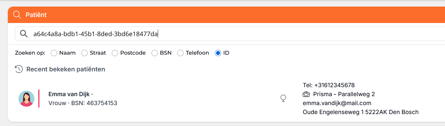In MediKIT is mogelijk om op dit id te zoeken vanuit de patiëntenzoekkaart. Vink hiervoor het bolletje ID aan.